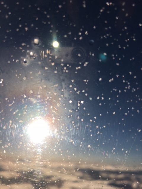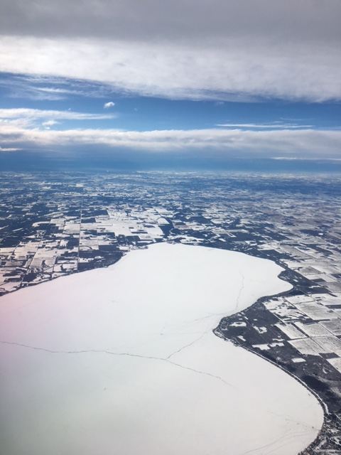 Flying over Alberta. 10000 feet above land that appears as quilted squared off shards of earth and snow. Mountainous clouds peak all around us. Gods, tinged with gold. Possessed by strength to fly. No, more: They stand watch. Slipping by. Ignoring the toils that go on far below.